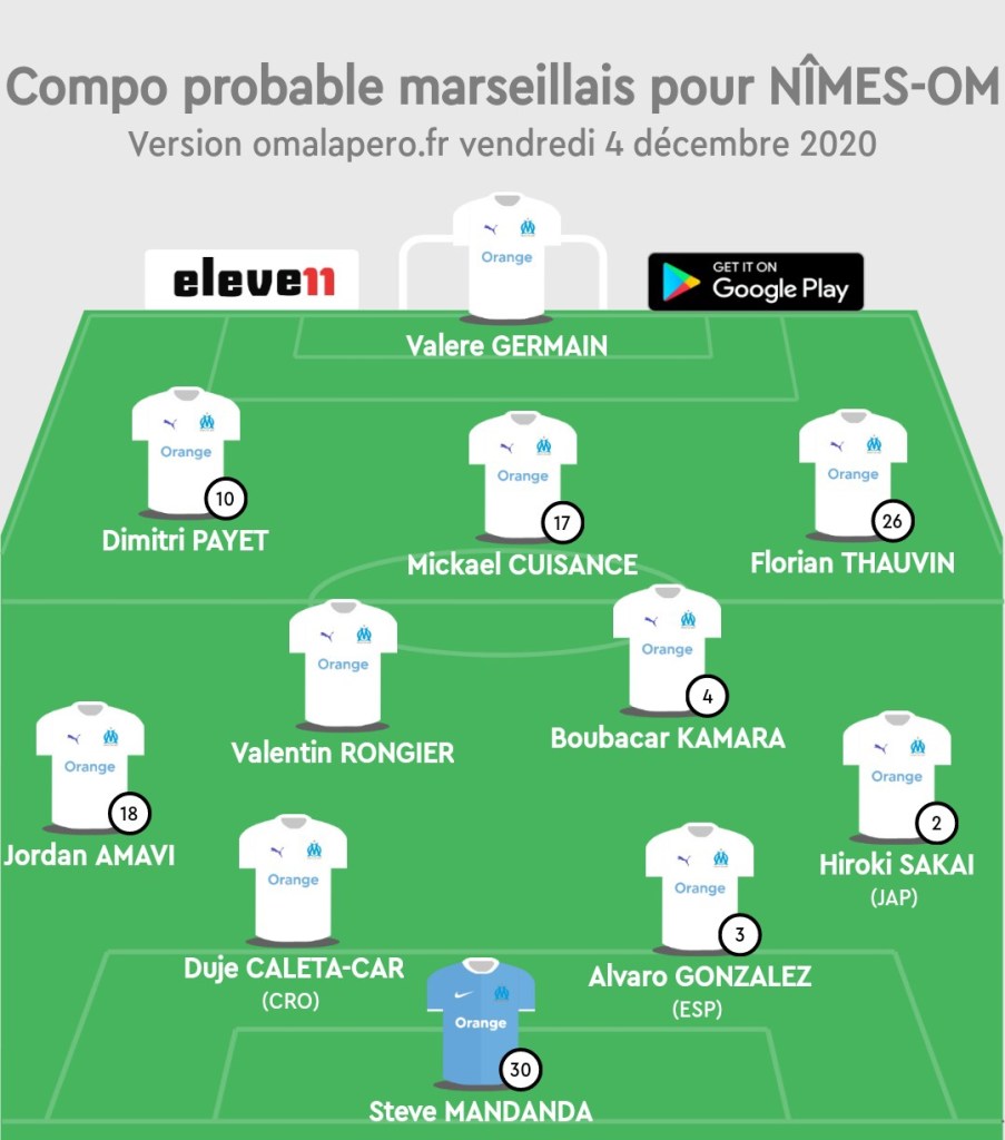 Équipe offensive qui mets en avant la complicité naissante entre Cuisance et Thauvin, avec Germinator préféré à Pipa pour sa combativité et sa qualité de jeu de tête (pas balle au pied hein!). Il y aura forcément beaucoup de coup de pieds arrêtés et ont peut espérer voir sa spéciale au premier poteau sur corner ou un coup de boule de DCC. Payet tout intermittent du spectacle qu’il est, devrait se régaler.
