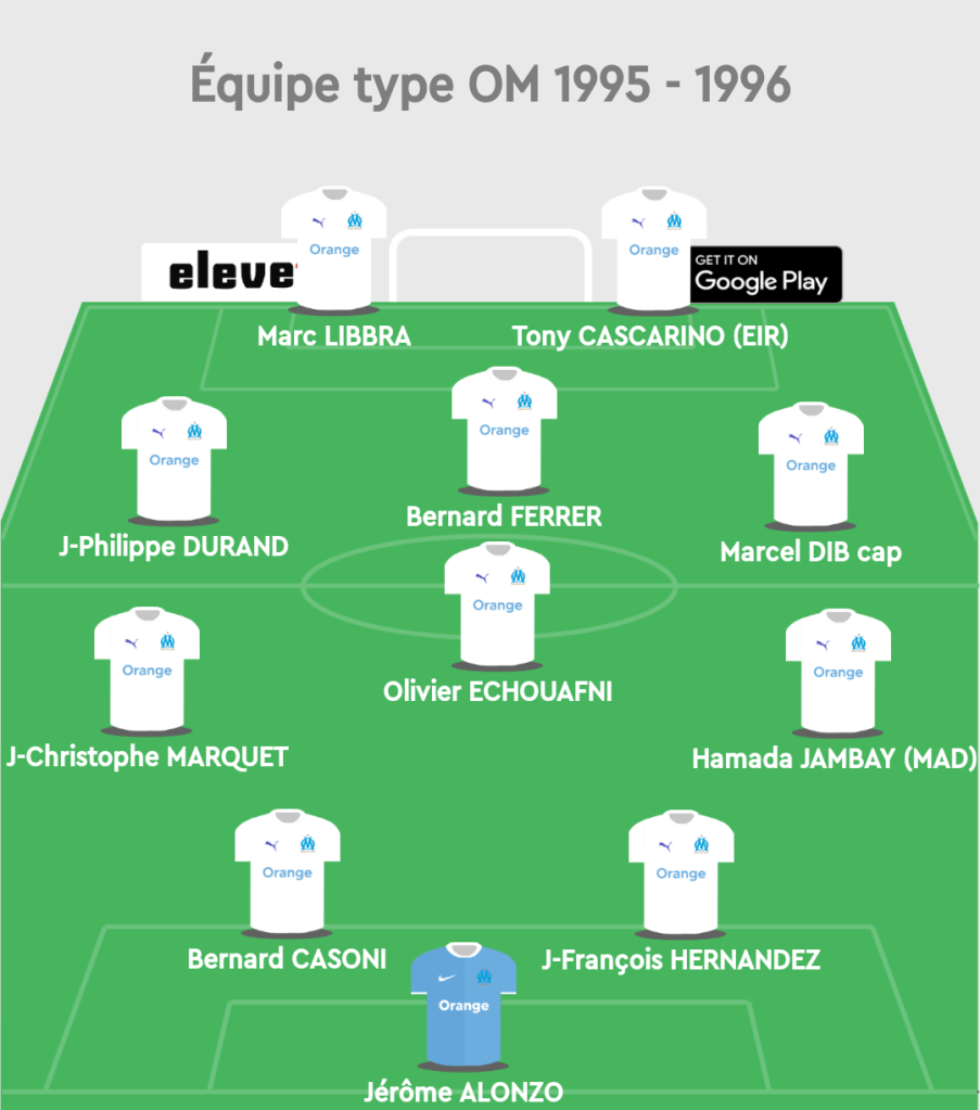 - 1995 marque le retour de l’emblème « OM » sur la poitrine et et le logo « MIZUNO » reste sur le sternum.