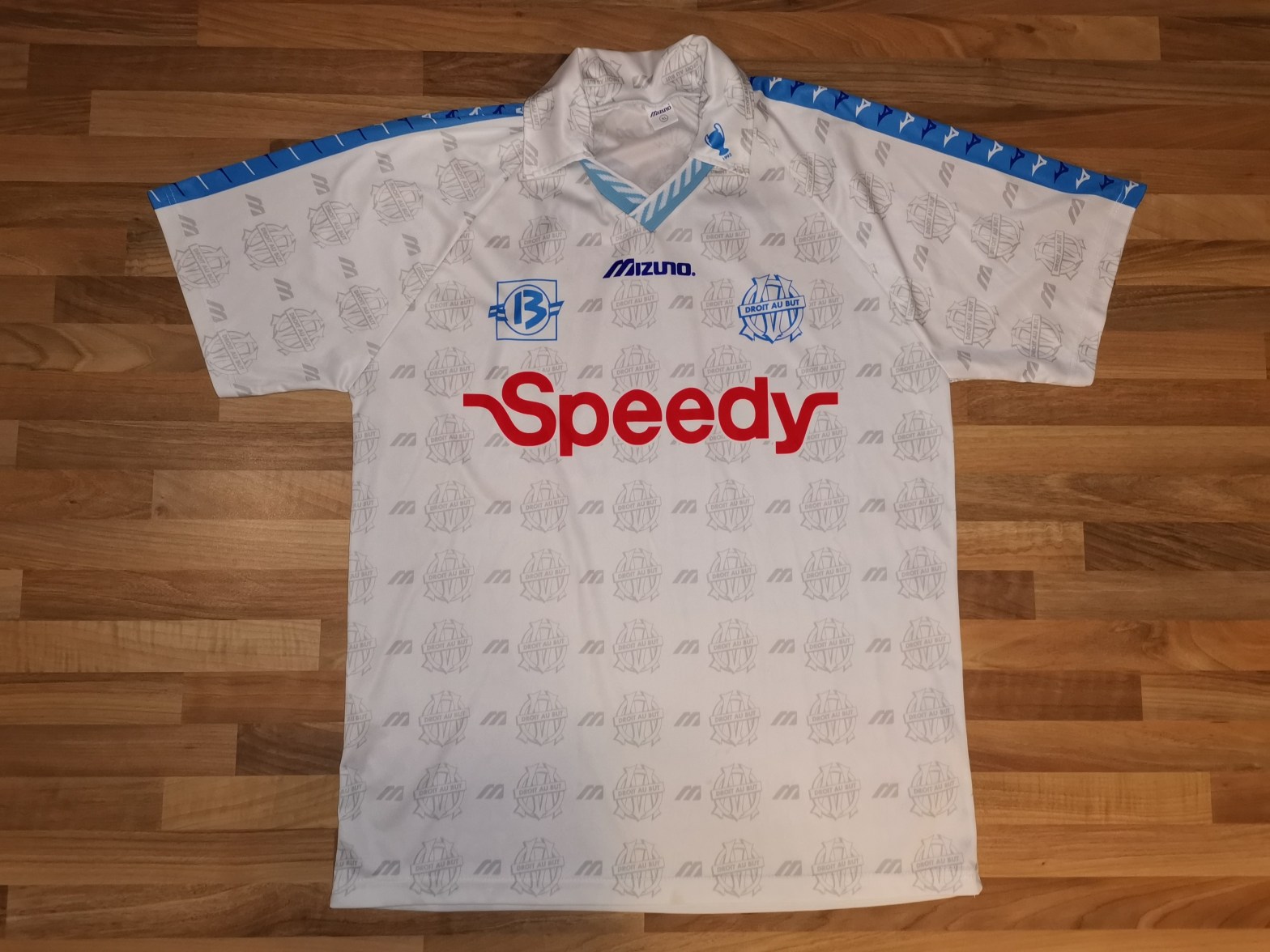 - 1995 marque le retour de l’emblème « OM » sur la poitrine et et le logo « MIZUNO » reste sur le sternum.