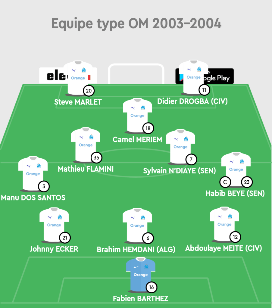 - La révélation de la saison l’ivoirien de l’OM Didier DROGBA finit troisième au classement des meilleurs buteurs du championnat de Ligue 1 avec 19 buts, à 7 buts du leader Djibril CISSE de l’AJ Auxerre.