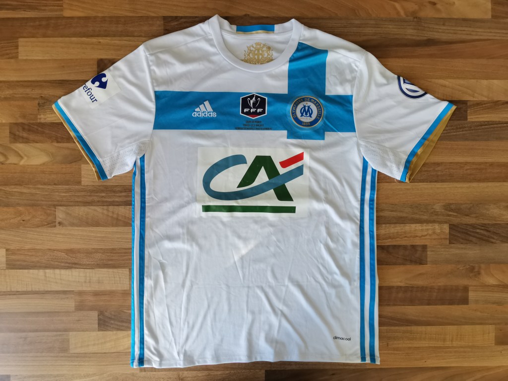 - Absent du maillot principal de l’OM depuis la saison 2004-2005, on retrouve cet élément des armoiries de la ville de Marseille sur la partie haute de la tenue avec une bande horizontale bleu ciel qui englobe le logo ADIDAS et le blason du club et qui rejoint une bande verticale sur le côté cœur.