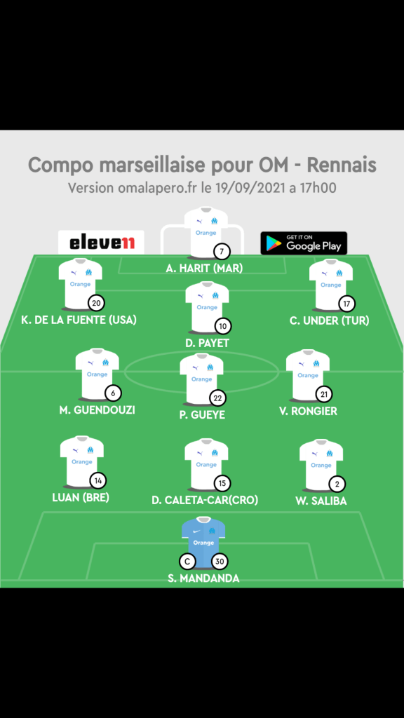 Le fameux 3/3/1/3 avec Rongier préféré à Lirola pour sa grande forme et son pressing, Kamara mis au repos, et Harit par défaut : Dieng n’étant pas dans le groupe. Dcc relancé préféré à Balerdi deux boulettes par match pour museler Guirassi et jouer long pour Under notamment.